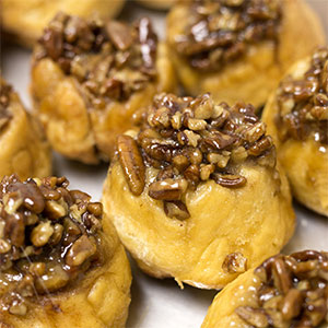 baked with cinnamon and topped with pecans in a sticky glaze